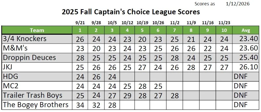 Our 2023 Fall League Champions are 3/4 Kockers who beat Gang Green by one stroke. Droppin Dueces held true to their name and dropped three on 2 Oldies and a Goodie to take the First Flight.