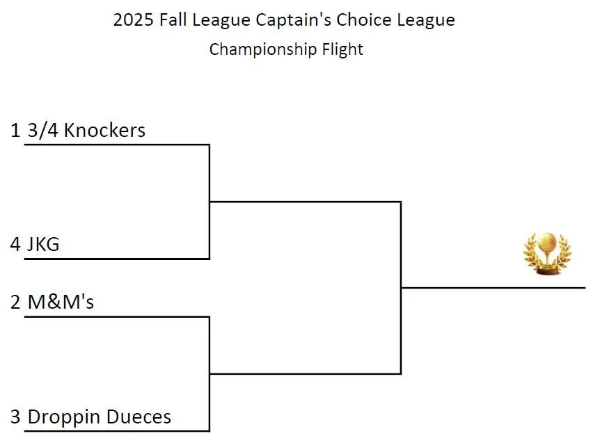 Fall League Playoffs have concluded. Congratulations to those who advanced to the Final Round. Updated brackets have been posted below and in the clubhouse.